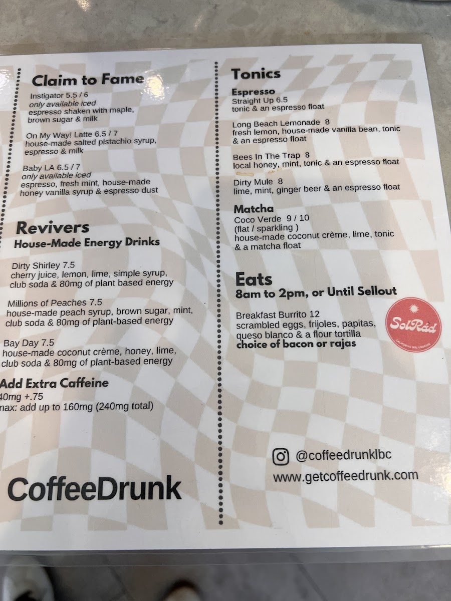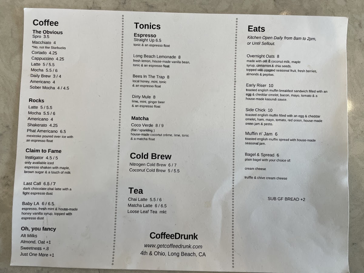 Nestled in the heart of Long Beach, CoffeeDrunk is an eclectic coffee shop that has quickly won the hearts of locals. Known for its vibrant atmosphere, this spot offers more than just great coffee—it's a destination for breakfast enthusiasts too. Their Breakfast Burrito, priced at $12, is a must-try, providing a hearty start to your day.